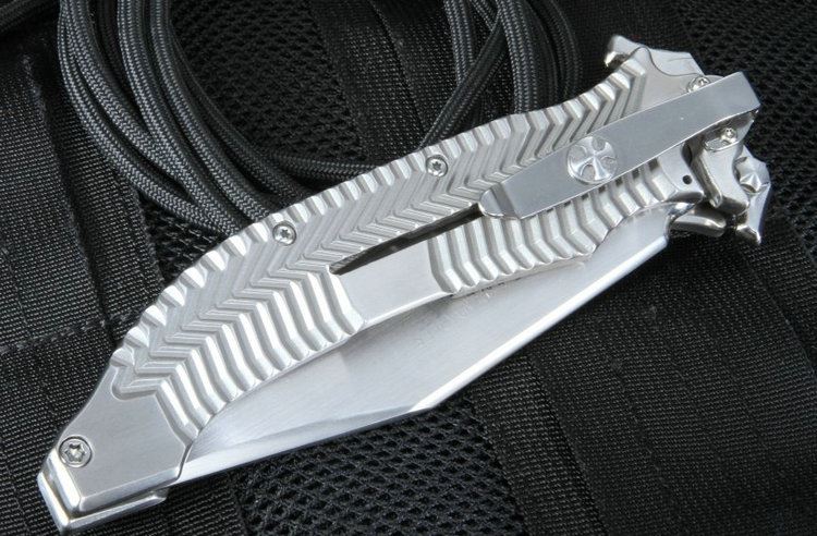 目前Darrel Ralph和Randall King等世界著名刀具设计师一起,组成了HTM刀具的设计师团队。 自2002年Darrel Ralph引进AXD刀具以来,该系列便成为市场上个最畅销的型号产品。它具有独特设计的外形,不管使用者手部大小如何都能完美的贴合。刀身采用平磨手法打磨出锋利的切割刃,几何刀头又赋予了这把刀强大的穿刺力,还记得电影里这把刀扎爆蓝球的场景吗?刀身采用能去除眩光效果的石洗工艺处理,这种处理办法可以防锈,更能防止刀具出现炫光效果。 刀柄采用航空级钛合金制作框架,并利用三维雕刻技术在刀柄框架外侧雕刻有防滑凹槽,增加使用者的把握手感和整体美观度。钛合金框架锁不仅增加了功能性还提供了安全耐久的保障,刀具闭合时的翼状刀鳍外观和刀具弹开时的清脆响声又是一种别样的享受。本款作品为全手动操作模式,利用手腕部的力量将刀具快速甩开,实在是酷毙了! ARTIST: Darrel Ralph BLADE SIZE: 5 1/4" TOTAL SIZE: 11 1/4" BLADE MATERIAL: Stainless S30V Steel HANDLE FRAME: Titanium - 3D machined WEIGHT: 8.8 oz. COMMENTS: Darrel Ralph Custom assisted 5 1/4" "The Expendables" model folding knife in a gorgeous machined titanium handle and stainless steel blade. Tanto style blade is razor sharp. Stunning combination of workmanship and materials. This knife has a blade tip down mounted titanium pocket clip, dual thumb studs/flipper for easy right or left hand opening. Fast assisted opening. Solid frame lock design. Tour de force in artistry by custom knifemaker Darrel Ralph. 材质 S30V 全长 28.25 CM 刃长 12.10 CM 刃厚 0.37 CM 刃宽 2.92 CM 硬度 59-61 HRC 柄材 6AL4V航空级钛合金 产地 美国