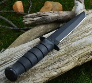 这把刀的刀身采用1095钢锻造,结构紧凑结实的短刀刀身非常坚固耐用。出于对短款战术直刀的考虑,这把刀在设计时有意的加大刀柄处的重量,这种设计让使用者即使长时间掌握也不会感到疲倦。而且重心靠后的设计让使用者可以更有力的把握刀具,几何形刀尖设计和锋利的刃部可快速穿透目标,让刀具拥有令人畏惧的贯穿能力。刀身表面使用黑色氧化粉末涂层处理,不反光且增加其防锈性能。防滑的科腾(Kraton G)提供了一种稳定的抓握力。这把刀与1254的区别在于,1254配备的是皮鞘,而这款产品则拥有坚硬的K鞘。