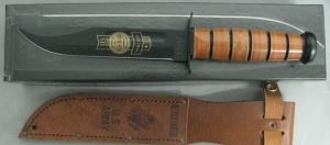 本款为美国原装进口,刀身刻有卡巴公司和美国陆军(U.S.Army)标志。粉末涂层外侧采用激光雕刻技术刻有115周年纪念以及卡巴的“Hardcore Knives Hardcore Lives(坚硬刀具 坚强人生)”字样。刀柄采用纯牛皮压制而成,即使沾上汗液也不会打滑。柄身带有军刀通用的5道防滑槽,手感非常好。黑色涂层的不锈钢护手可以保证使用时的绝对安全,尾端圆头在必要时可发挥击锤作用。