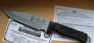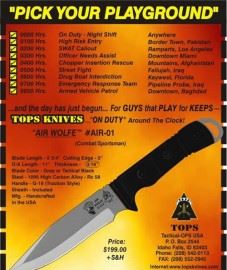 Tops Tactical Ops USA --中文称为:尖端战术-刀具公司,这个全球知名的专业刀具制造商位于美国的爱达荷州(IDAHO),是由“Mike Fuller”(迈克福勒)先生创办的。TOPS公司有一句格言在业界无人不晓:“One knife one Life”意思是:一生可以信赖的刀具,也可以翻译成:一生使用这一把刀就够了! TOPS公司的产品都是实用性很强的战术刀具,因为老板“福勒”先生以前就是参加过越战的特种部队成员,同时他还召集了许多有相似背景的精英,前任海豹部队指挥官、南非SAS侦察突击队队员、凤凰城SWAT特警队指挥官等一些有着丰富经验的专业人士都是他们的设计师。 他们的产品并没有华丽的外表,甚至没有完整的包装,TOPS公司发言人说:“定制的军刀既是战斗的武器,又是士兵野外生存的工具。它是士兵们最忠实的朋友,只有士兵们才能够体会到在战斗的时候,军刀和他们生命之间存在的亲密关系。 由于产品的实用性强,设计合理而独特,美国政府各个兵种部队开始选购他们的产品。各州警局、西亚沙漠、南非草原都有它的身影,其中最知名的有两个事例,其一是阿帕奇战斗直升机的机组人员把它作为了标准装备。其二是美国航空安全局的空中警察,在911事件以后也选用了它的产品作为执法利器。 YOU DON'T HAVE TO BE THE 'TOP GUN' TO KNOW THAT THE AIR CREWS WORK HARD TO COMPLETE THEIR MISSIONS. EVERY PERSON ON THE AIR CREW HAS GREAT RESPONSIBILITY AND IS AS IMPORTANT AS A SPOKE IN THE WHEEL.... HAVING THE 'RIGHT TOOL' AT THEIR SIDE OR IN THEIR BAG IS AN IMPORTANT PART OF THEIR 'PERSONAL RESPONSIBILITY. THE AIR WOLFE FITS THE BILL PERFECTLY, FOR YEARS IT IS A PERSONAL CARRY CHOICE, IN CASE OF WORK OR AN EMERGENCY, ON THE GROUND OR IN THE AIR. CUTTING STRAPS, ROPE OR EVEN BUILDING AN EMERGENCY SHELTER IT IS A PERFECT TOOL... AND WITH YOU... JUST IN CASE "YOUR HAVING A DOWN DAY" Blade Length: 5 3/4" O/A Length: 11" (全长大约28厘米) Cutting Edge: 5" Thickness: 3/16" Blade Color: Tactical Gray Steel: 1095 High Carbon Alloy RC-58 Handle Material: Black G-10 / Traction Style Sheath: Ballistic Nylon Weight: 11.5oz Weight w/ Sheath: 16.5oz Mfg. Handcrafted in the USA