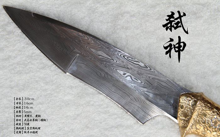 老刀坊-弑神 老刀坊作品是采用进口大马士革为原料,钢材昂贵,刀刃上花纹清晰,刀柄是名贵木材,纯手工制作,生产速度慢为特点;图片上的饰物不作赠送。 上一款:老刀坊-龙鳞—(1号) 下一款:老刀坊-追命