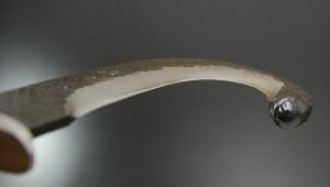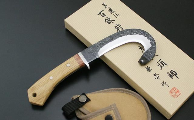 Kanetsune 日本关兼常 TS-81 钩形狩猎刀由关兼长所制的刀款是专门针对狩猎人士所设计制作的一把钩形状的猎刀,全刀采日本日立金属所制之青纸二号钢材制作,握柄以结实槛木制成,主要用途类似剥皮刀,但它的破坏力更远胜于一般用刀;用于肢解野兽外皮及内脏硬骨方面能发挥强大的功效,对于经常狩猎人士是相当不错的选择。