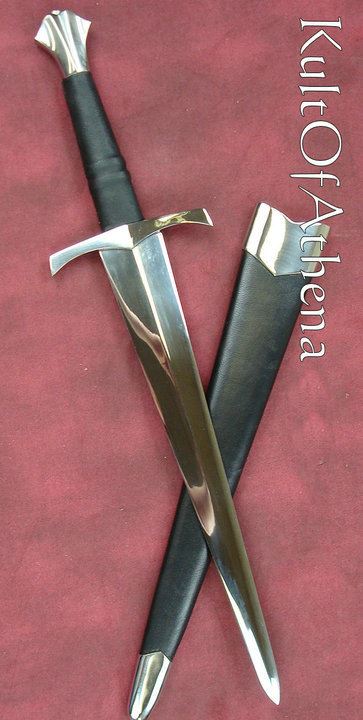 Modeled on the Italian concept of sword design, the blade and balance slightly favors thrusting attacks, however, its cutting edges are astonishingly effective too and can deliver some down right ferocious blows. Additionally, its simple cruciform hilt is also all business with a long upturned cross guard, leather-over-wood grip, and a counter balancing fish tail pommel. Fast as a frog?s tongue the Italian Sword is deadly in a fight and built like a tank.