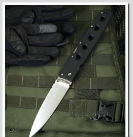 Cold Steel 美国冷钢公司,1980年由Lynn Thompson武术家和猎手创办于美国,是美国著名多元化冷钢刀,折刀、直刀生产制造商,设计师为Lynn Thompson 以及一些日本刀匠。冷钢,美国品牌,日本生产,使用Aus系列,还有三美等各种高档钢材生产各种刀具产品,Cold Steel 美国冷钢坚持所生产的刀都必须是高性能的,亦即从最小最便宜的到最好最昂贵的刀,皆须符合这个要求。每一把刀的性能都必须超越它的价格,也就是必须"物超所值"。为了达成这种目标,Cold Steel 美国冷钢全力投入研究高性能刀必须具备的条件。就刀而言,这些包括断面、厚度、刀身几何、刀刃几何、钢材以及热处理等,上述每一项条件都被精研至所有细节,以达到各种刀子各项特殊用途的最佳整合效果。如果是折刀,冷钢把重点放在它的锁扣系统,以确保最强固、最安全的结构。若是刀柄,则致力于开发材料于人体工程学的完美组合,以提供舒适、牢固的握持。然而,最重要的是:冷钢测试自己的产品!"严格的测试"是确保获得我们所要求的性能等级的唯一方法。刀子坚实可靠的性能,可在使用多年后,能仍然提供忠实的服务及美好的回忆。It's so big!! 这是拿到这把刀的第一感觉,大而不重,HOLD OUT系列的最大号,背锁,单纯的右手开刀推刀柱。