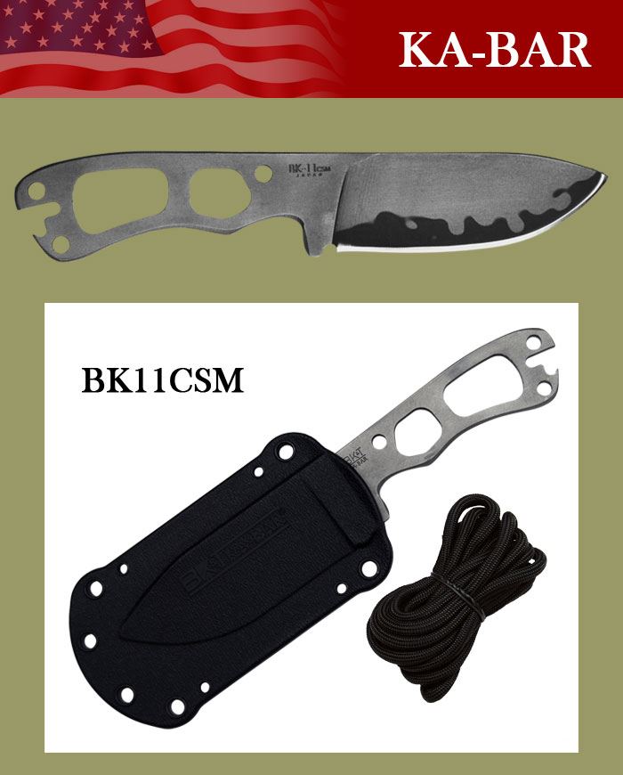BK11CSM是对贝克尔BK11的更新设计,在保持原有尺寸的同时采用碳夹钢金属设计在白色高碳钢的基础上核心加上410高级不锈钢层。重新设计了手柄样式并且与BK&T卡巴纪念邮票克尔是相同的。去除原本的金属腰带夹更换为黑色子托形成的刀鞘配合了550型线,可以很容易的打开或者闭合并且可以随身栓在很多装备上。