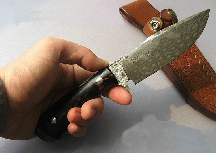 在进行刀具锻造上,一直都不缺乏天才,无论是锻造,切模或是热处理,研磨等工艺都需要完美掌控。各个时代和阶段都有各种不同有突出表现的刀艺师涌现出来而被人们所记住。 但是,我们不得不承认的是,经过漫长时间的经验积累和工艺发展,目前刀具业界已经达到百花齐放的时代。每一位刀匠的技艺都非常纯熟,对钢材和各个工艺的处理都有着独特的理解的操作。可以这样说,如果不是美国ABS协会的MS级刀匠有着严格的名额限制,那么如果按照目前的评选标准,MS级大师的人数将翻上数翻。 This is the new, updated version of an old favorite and a true work horse, with a cool look. This full-tang hunter is made from my "ball-bearing" high carbon damascus forged from 52100 ball-bearings and 1095 powder done in a canister weld. This style hunter has an integral guard, thumb drop (for extra control) and an open/exposed pommel with lanyard hole. The knife is 8 7/8" overall with a 4 1/8" cutting edge. The knife is has forge marked and acid soaked flats to contrast the etched damascus. The handle scales are top grade, stabilized Flame Ebony wood secured with stainless steel handle bolts. The knife comes with a tooled leather pouch sheath with belt loop. 全长:22.5CM 刃长:10.5CM 刃材:52100轴承钢+钢锻造大马士革 硬度:62HRC 刀柄:稳化火焰乌木 刀鞘:定制皮鞘